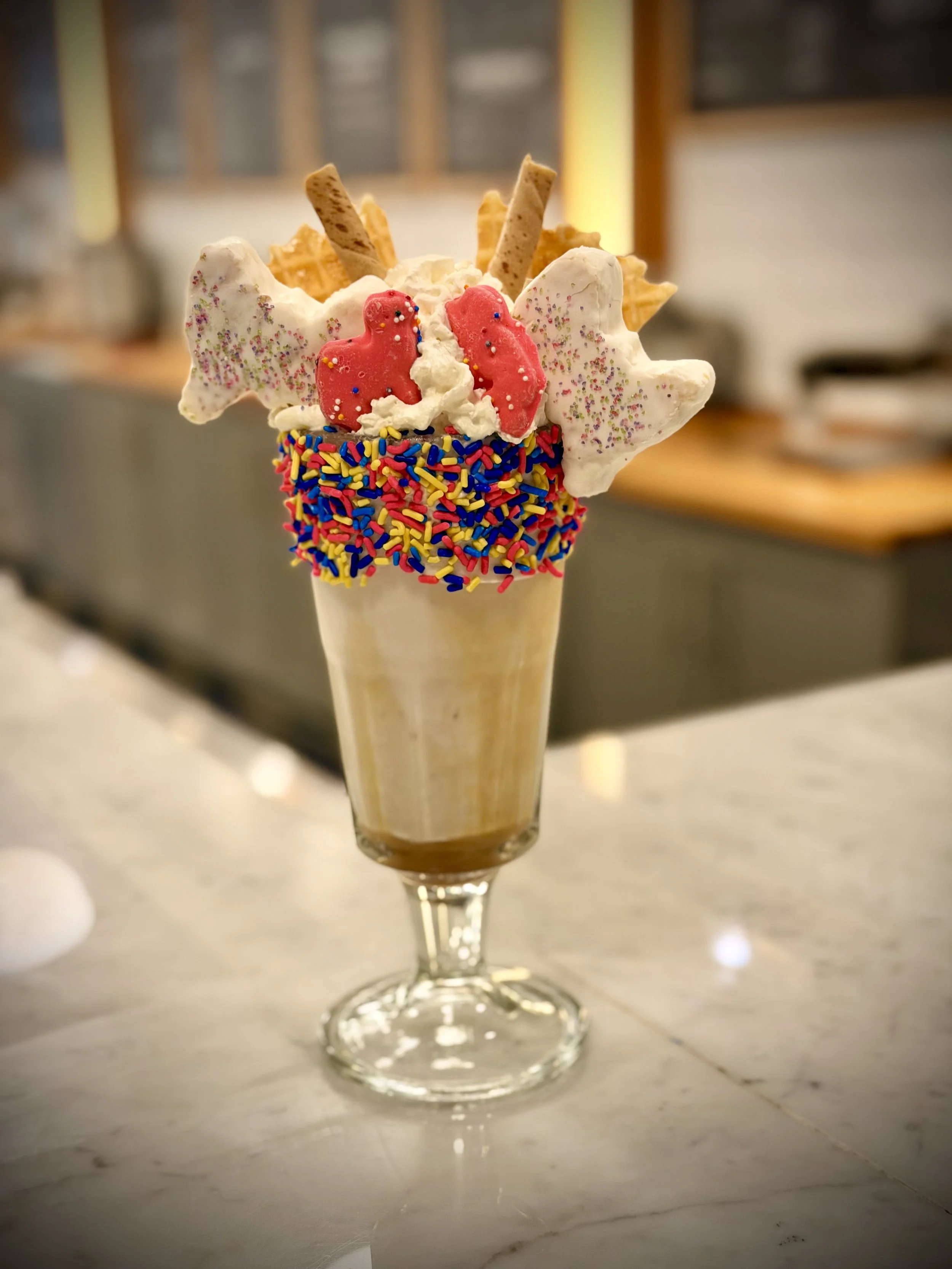 "Very nice themed fountain soda shop and ice cream parlor. This place made me feel like a kid again getting ice cream with my grandparents. There is an old time radio playing music by the front. There are barstools and a nice clean countertop to sit and enjoy your dessert. Staff was friendly and explained the options well. We ordered an Ice Cream Soda in Rootbeer phosphate flavor, mixed with a butter toffee ice cream! This was fantastic and delicious. When we come back to town we will definitely return."